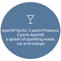 Aperol Aperitif Spritz is made from 3 parts Prosecco, 2 parts Aperitif, a splash of mineral water, ice and orange.